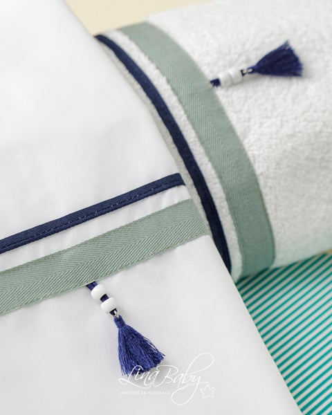 Υπέροχο βαμβακερό σετ λαδόπανων, διακοσμημένο με βαμβακερές τρέσες σε δροσερούς τόνους μπλε και μέντας, που χαρίζουν φρεσκάδα και αρμονία.