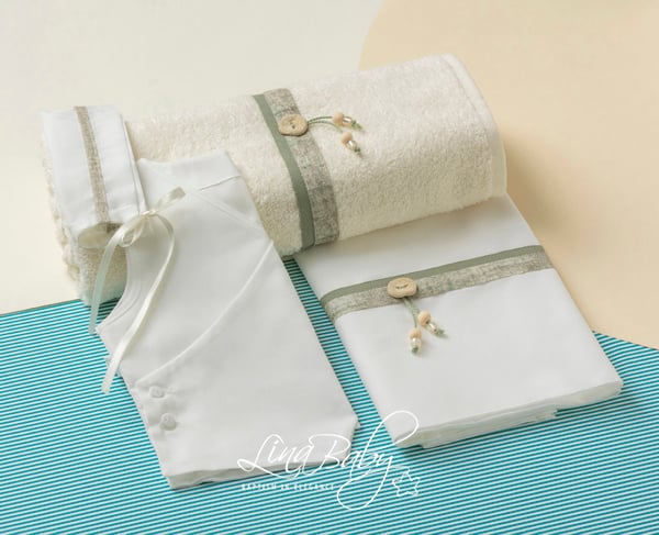 Εκρού βαμβακερό σετ λαδόπανων με χακί τρέσα, λαδί μελανζέ ρέλι και boho λεπτομέρειες με κουμπί & χαντρούλες.