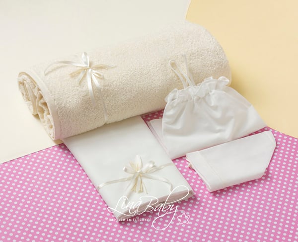 Η απλότητα που ξεχωρίζει …Το βαμβακερό σετ λαδόπανου Lina Baby αποτυπώνει τη διαχρονική κομψότητα μέσα από μίνιμαλ λεπτομέρειες. Διαθέσιμο σε λευκό και ιβουάρ, διακοσμημένο με φίνα σατέν κορδέλα και ένα διακριτικό δαντελένιο φιογκάκι, για μια βάπτιση γεμάτη φως και φινέτσα.
