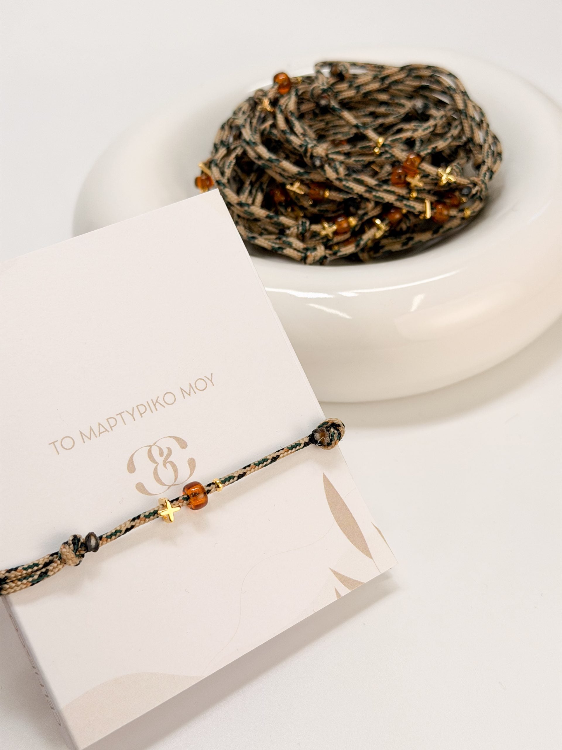 Μαρτυρικό βραχιόλι με κορδόνι σε 3 αποχρώσεις,καφέ ακρυλική χάντρα και επιχρυσωμένο σταυρό.