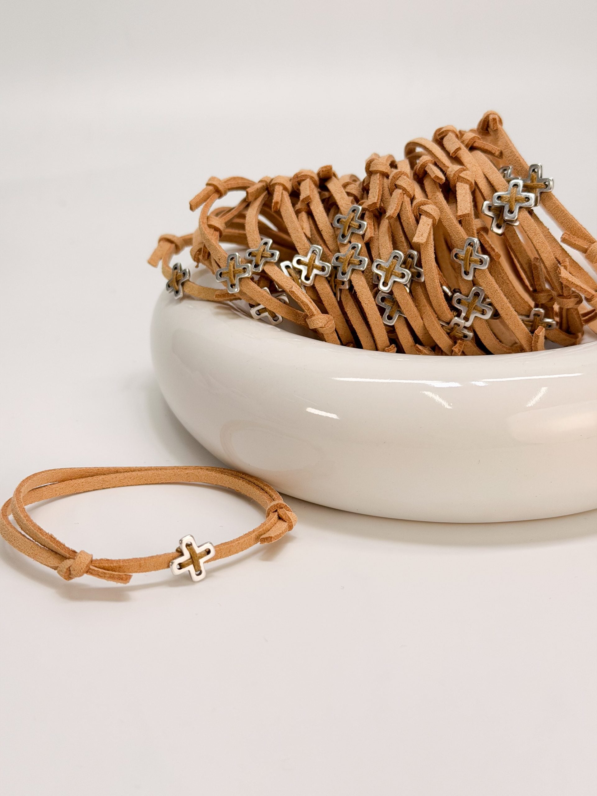 Μαρτυρικό βραχιόλι με μπεζ σουετ κορδόνι,κεντητό σταυρό σε ασημί απόχρωση.