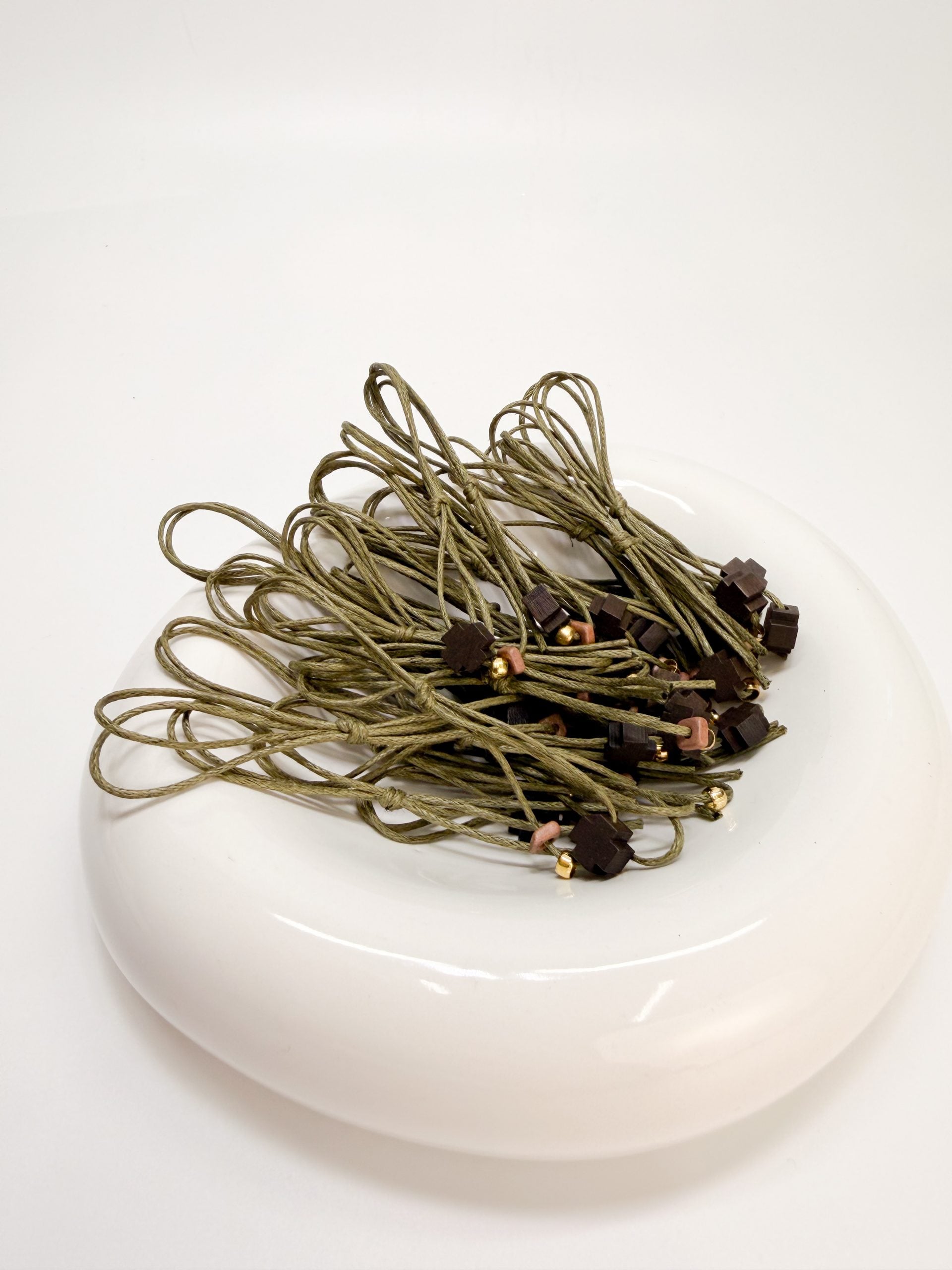 Μαρτυρικό πέτο με λαδί κορδόνι,καφέ ξύλινο σταυρό και ροδέλα κεραμική.
