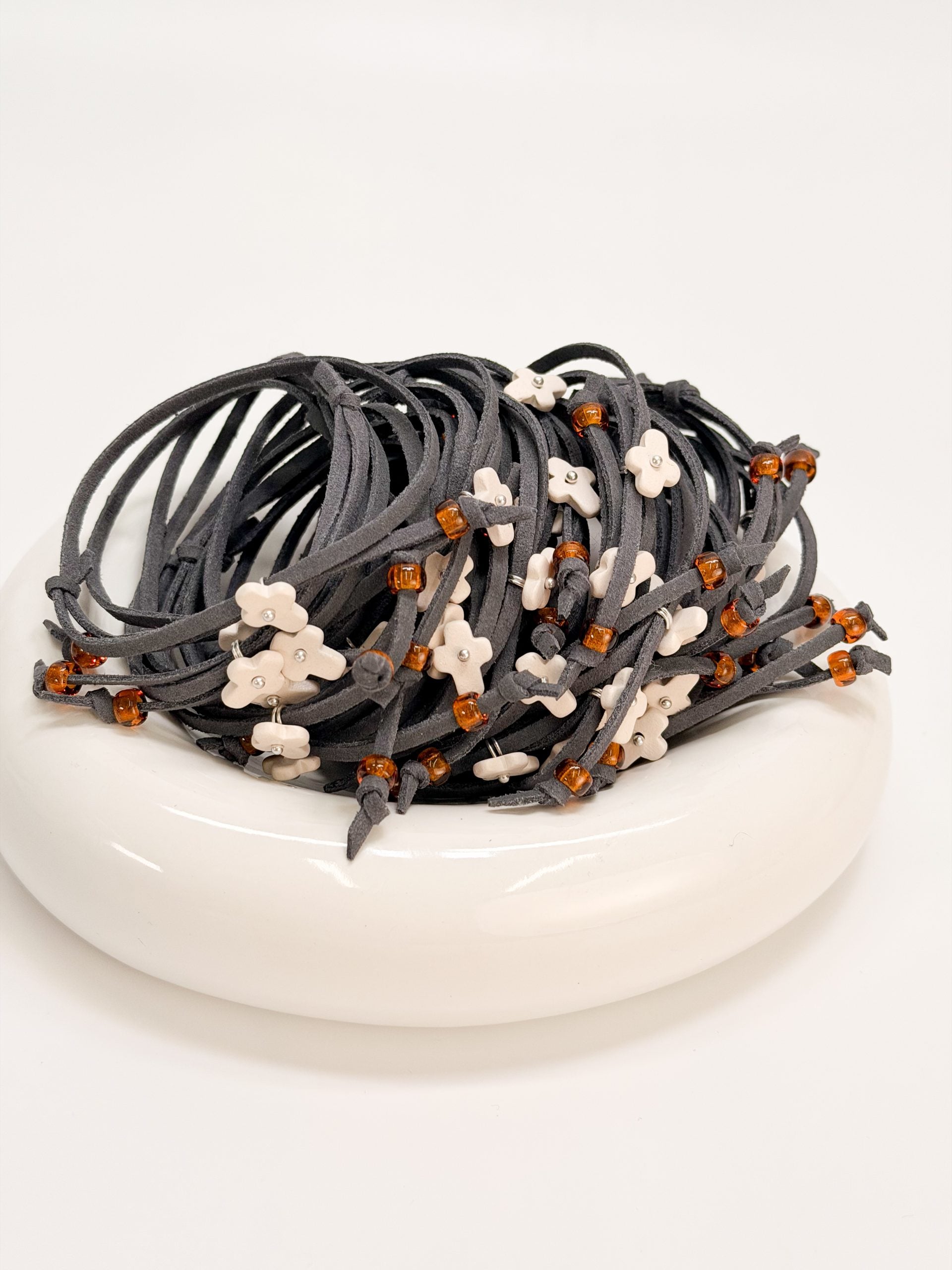Μαρτυρικό βραχιόλι με γκρι σουετ κορδόνι,κεραμικό σταυρό και καφέ χάντρα.