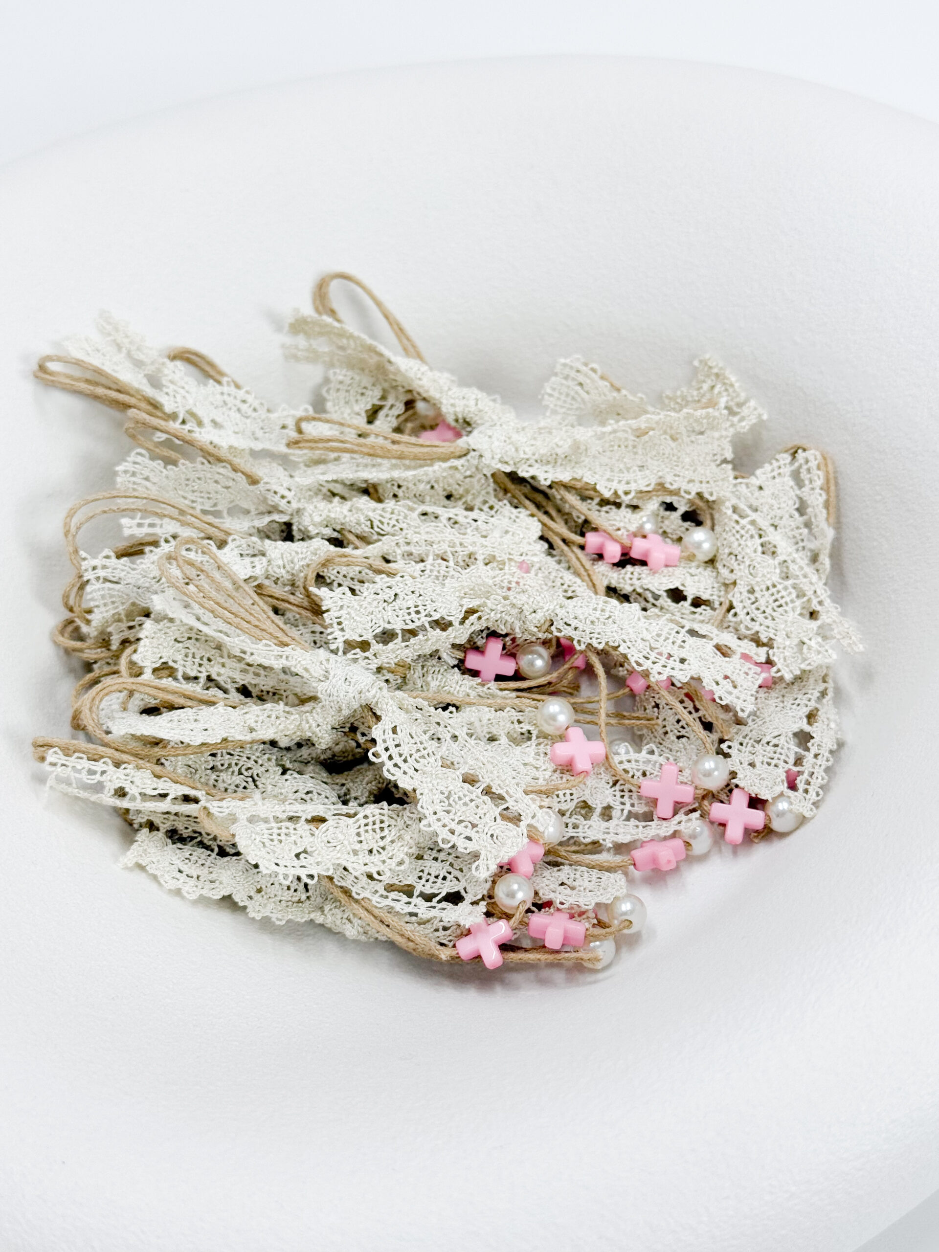 Μαρτυρικό καρφίτσα με δαντέλα ,πλαστικό σταυρό, και κερωμένο κορδόνι.