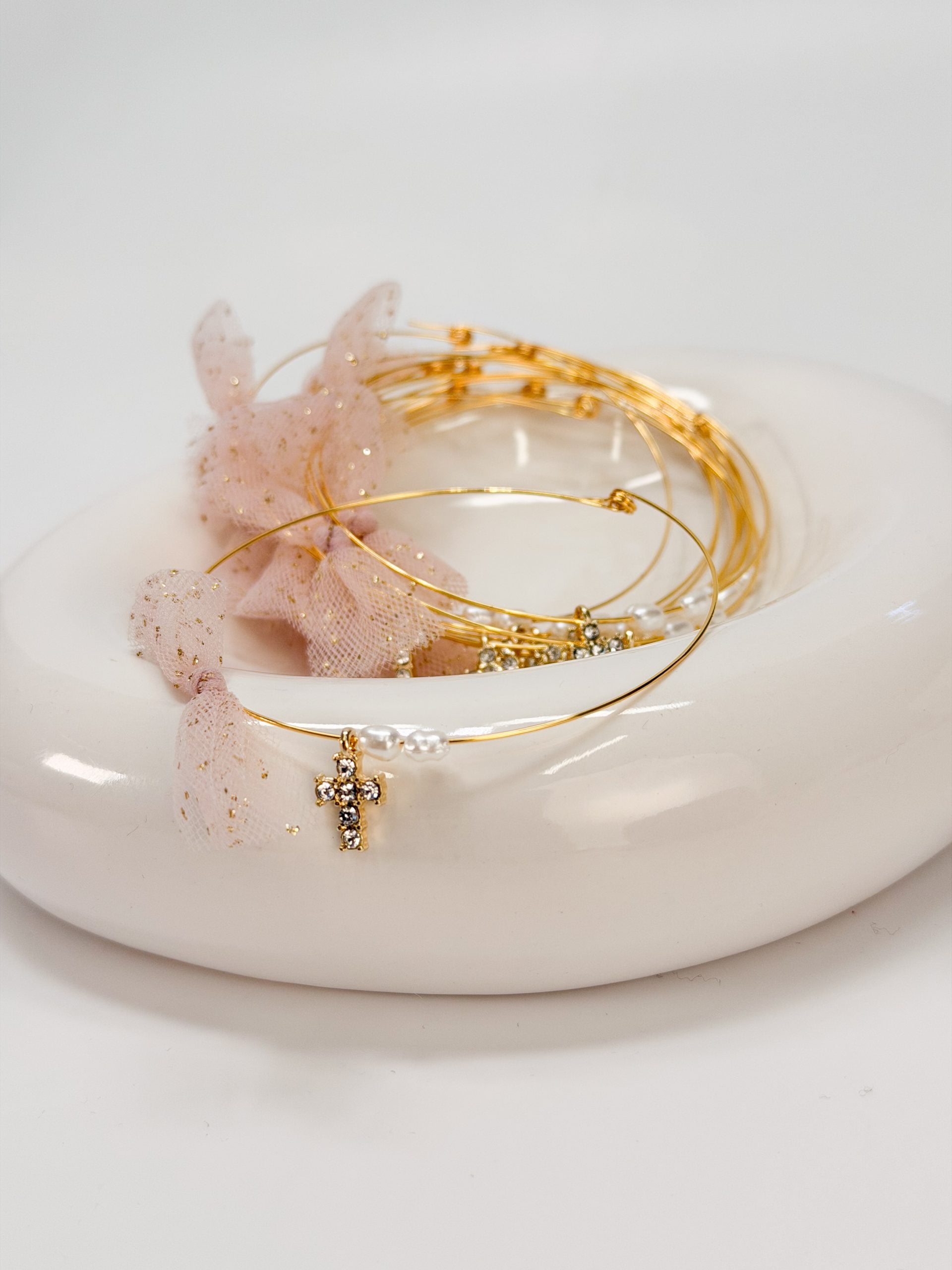 Μαρτυρικό βραχιόλι με memory wire,πέρλες,φιογκάκι με τρέσα σε ροζ απόχρωση και χρυσά flakes και επιχρυσωμένο σταυρό με στρας.