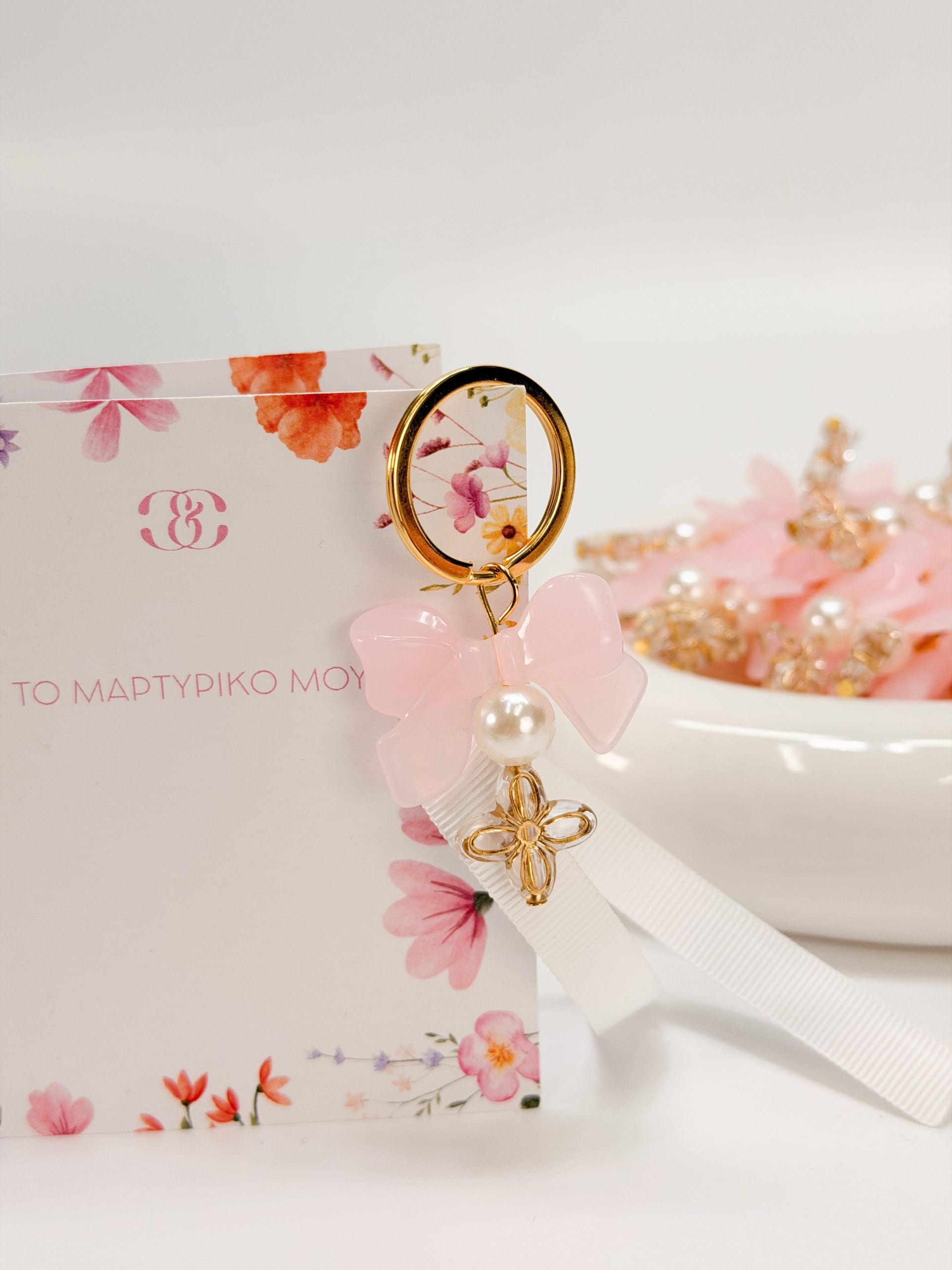Μαρτυρικό μπρελοκ με χάντρα φιογκάκι,πέρλα και σταυρό σε σχήμα λουλουδιού.