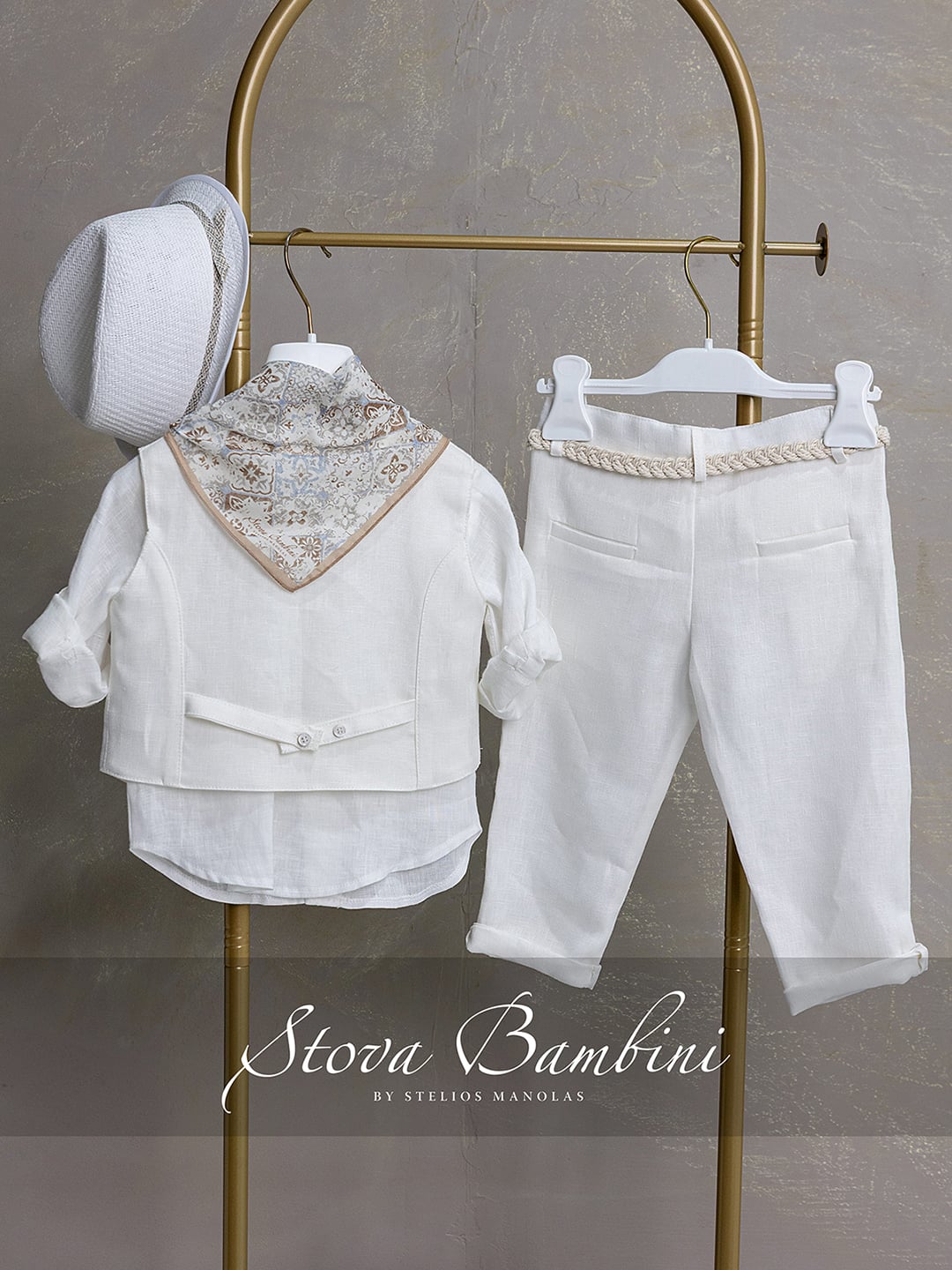 Βαπτιστικό σύνολο 6 τεμ. από 100% Top Quality Linen. Αποτελείται από λινό γιλέκο, λινό πουκάμισο με “Mao” γιακά, λινό παντελόνι με ζώνη δερμάτινη/πλεκτή και εσωτερικό λάστιχο στην μέση. Το σετ ολοκληρώνεται με υπέροχο Ιταλικό printed φουλάρι και ασορτί καπέλο. Διακριτική λεπτομέρεια ιταλικά κουμπιά με Logo Stova Bambini.