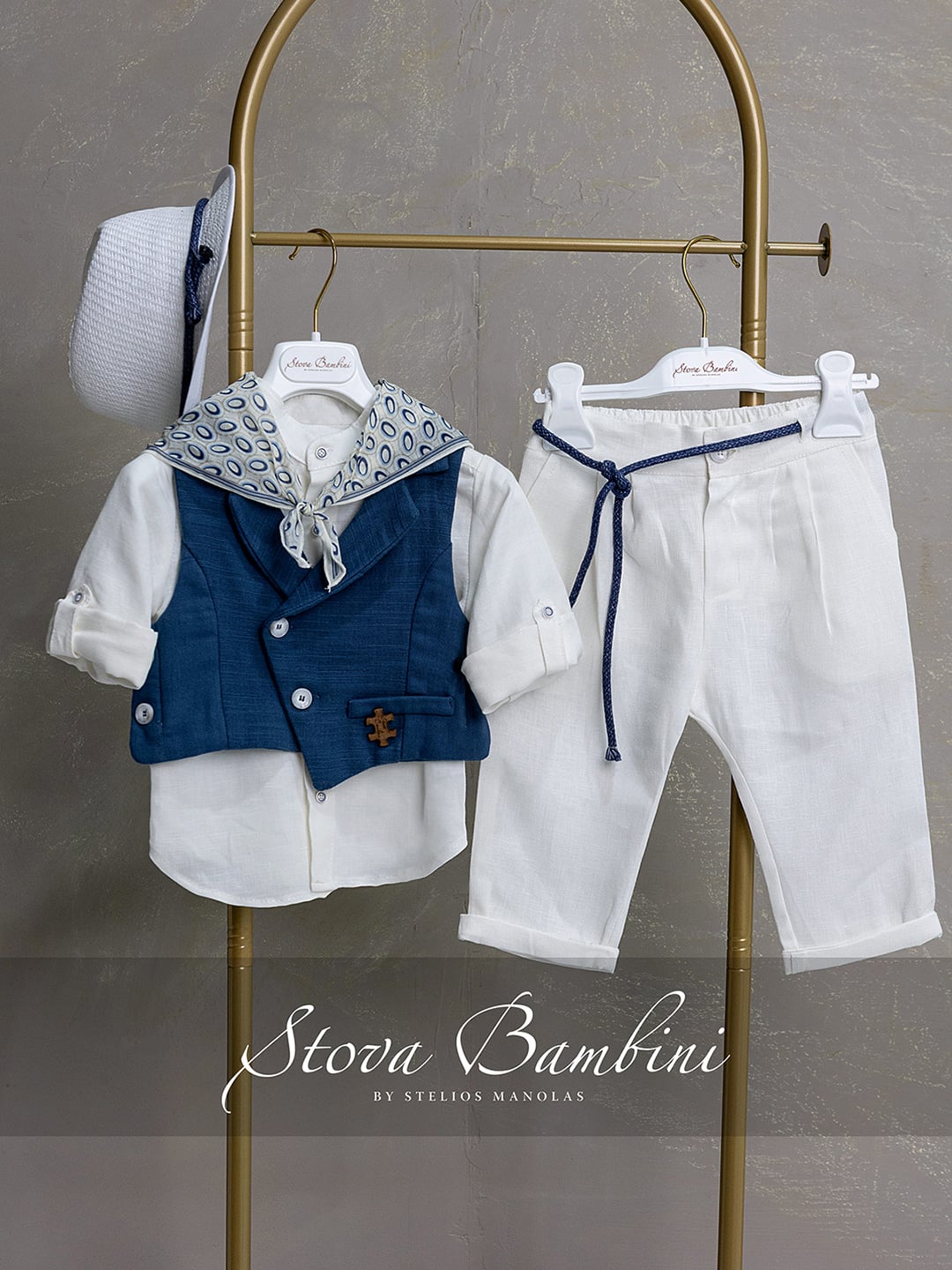 Βαπτιστικό σύνολο 5 τεμ. από 100% Top Quality υλικά. Το νέο ασύμμετρο, κρουαζέ γιλέκο από 100% ισπανικό βαμβάκι σε απόχρωση Midnight Blue ξεχωρίζει για τον ιδιαίτερο χαρακτήρα του, ενώ ολοκληρώνεται με κρεμαστά δερμάτινα αξεσουάρ από ιταλικό Nappa δέρμα, διακοσμημένα με το λογότυπο Stova Bambini — μια αυθεντική signature λεπτομέρεια. Το πουκάμισο με Mao γιακά είναι από λινό/βαμβάκι Ιταλίας και προσδίδει minimal κομψότητα, ενώ το νέο σχέδιο παντελονιού Stova σε λευκό Top Quality 100% Linen, προσφέρει άψογη εφαρμογή χάρη στη ζώνη/κορδόνι που ενσωματώνεται εσωτερικά. Το σύνολο ολοκληρώνεται με Ιταλικό printed φουλάρι και ασορτί καπέλο, δημιουργώντας ένα ολοκληρωμένο, refined look.