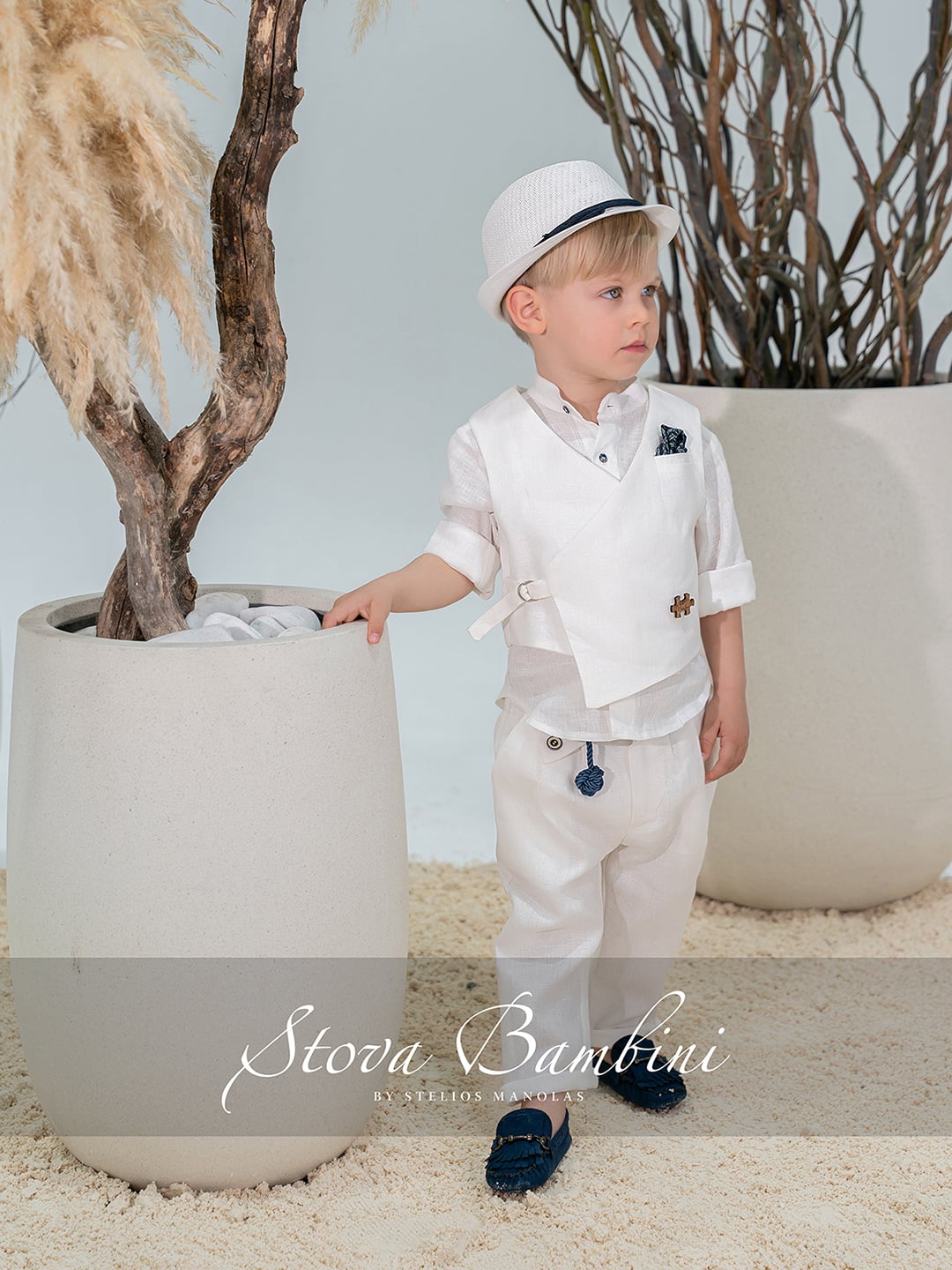 Βαπτιστικό σύνολο 6 τεμ. από 100% Top Quality Linen. Το κλασικό wrap-style γιλέκο Stova από 100% ισπανικό λινό σε λευκή απόχρωση αναδεικνύει τον διαχρονικό χαρακτήρα του brand. Άψογα συνδυασμένο με πουκάμισο με Mao γιακά (100% Top Quality Linen) σε λευκή απόχρωση , ενώ το νέο σχέδιο παντελονιού Stova σε λευκό λινό, προσφέρει άψογη εφαρμογή και δένει αρμονικά με την μοναδική πλεκτή ζώνη απο φυσικό σχοινί με signature κόμπο. Το σύνολο ολοκληρώνεται με ιταλικό pochette με ιδιαίτερο print και ασορτί καπέλο, δημιουργώντας ένα ολοκληρωμένο, Stova look.