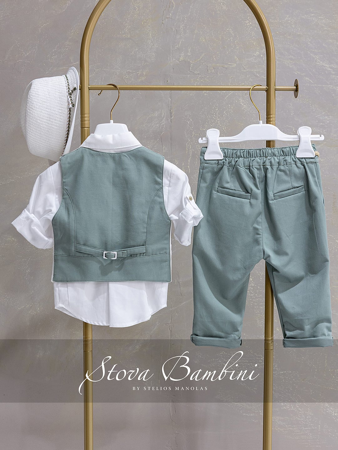 Stova Bambini βαπτιστικό σύνολο 5 τεμ. σχεδιασμένο με κομψότητα και διαχρονική αισθητική, από 100% top quality υλικά. Το κρουαζέ γιλέκο σε white απόχρωση από υψηλής ποιότητας βαμβακερό ύφασμα Ισπανίας με φυσική ανάγλυφη υφή αποπνέει έναν διαχρονικό χαρακτήρα, ενώ διακοσμείται με ιδιαίτερα κουμπιά τύπου ταρταρούγα δημιουργώντας ένα υπέροχο κλασσικό βαπτιστικό σύνολο. Το λευκό πουκάμισο από 100% βαμβάκι Ισπανίας, προσθέτει φρεσκάδα και καλοκαιρινή κομψότητα, ολοκληρώνοντας ιδανικά την εικόνα. Η βαμβακερή καπαρντίνα Ισπανίας σε απόχρωση μέντας που έχει επιλεχθεί για το παντελόνι σε χαλαρή, άνετη γραμμή προσφέρει άνεση και στυλ, ιδανικό για τις ζεστές ημέρες του καλοκαιριού. Το σύνολο ολοκληρώνεται με ένα υπέροχο παπιγιόν από το ύφασμα του παντελονιού.