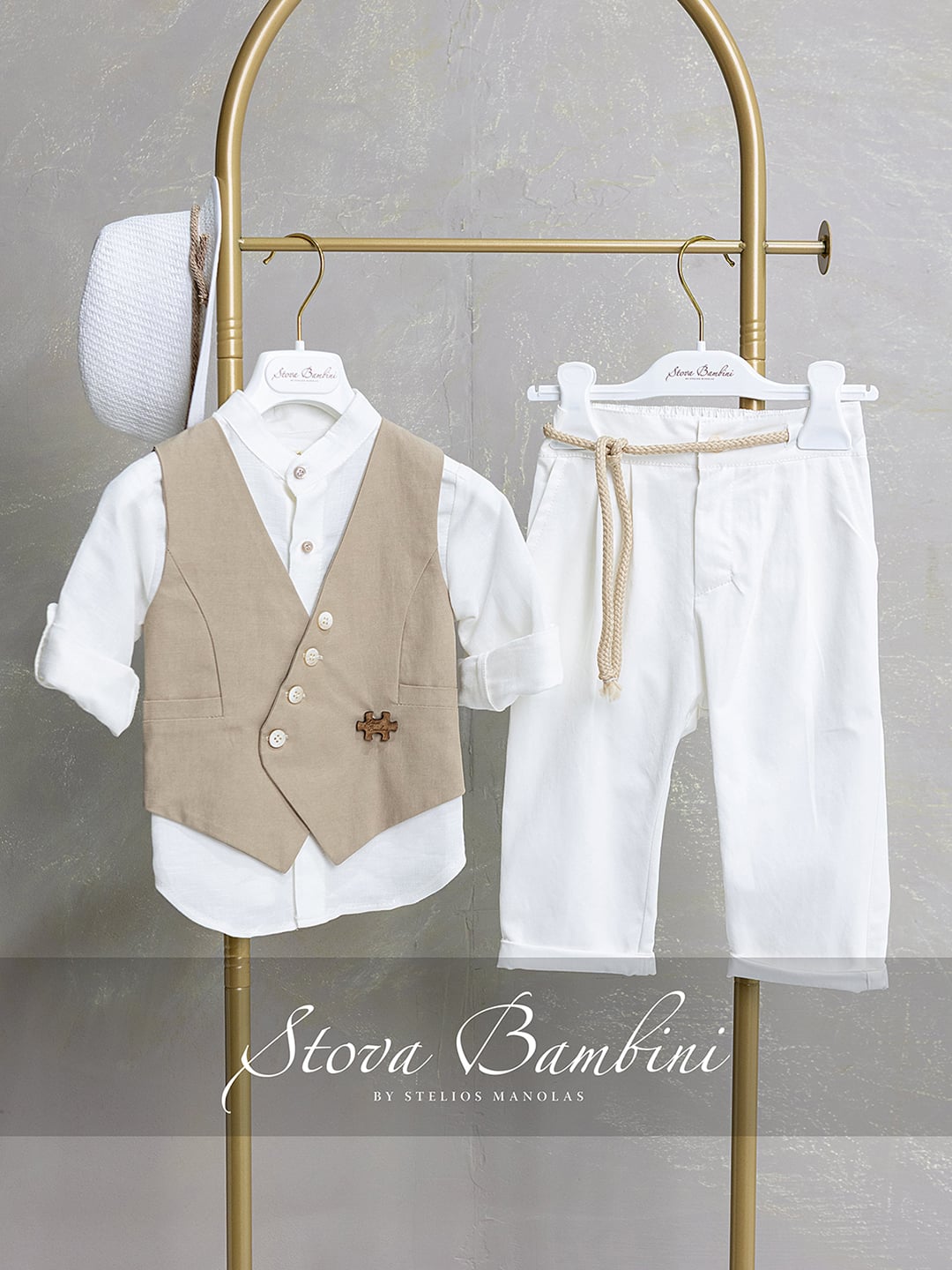 Stova Bambini βαπτιστικό σύνολο 4 τεμ. σχεδιασμένο με κομψότητα και διαχρονική αισθητική, από 100% top quality υλικά. Το κρουαζέ γιλέκο σε Mocca απόχρωση από υψηλής ποιότητας βαμβακερό ύφασμα Ισπανίας αποπνέει έναν διαχρονικό χαρακτήρα, ενώ διακοσμείται με ιδιαίτερα κουμπιά σε light Beige απόχρωση δημιουργώντας ένα υπέροχο κλασσικό βαπτιστικό σύνολο. Το λευκό πουκάμισο από λινό/βαμβάκι Ιταλίας, προσθέτει φρεσκάδα και καλοκαιρινή κομψότητα, ολοκληρώνοντας ιδανικά την εικόνα. Η βαμβακερή καπαρντίνα Ισπανίας σε απόχρωση off-white που έχει επιλεχθεί για το παντελόνι σε χαλαρή, άνετη γραμμή προσφέρει άνεση και στυλ, ιδανικό για τις ζεστές ημέρες του καλοκαιριού.