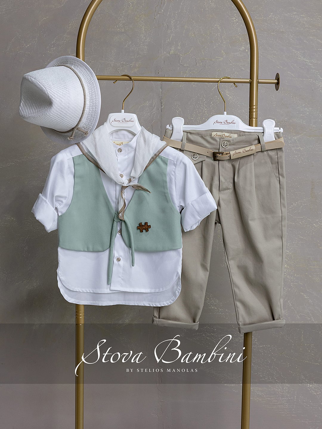 Ένα νέο αέρινο σύνολο γιλέκου σε αποχρώσεις μπεζ και πράσινης μέντας με ενσωματωμένο λευκό πουκάμισο από πολυτελές βαμβακερό ύφασμα Ιταλίας, συνδυασμένο με βαμβακερό παντελόνι με ζώνη δερμάτινη/πλεκτή και εσωτερικό λάστιχο στην μέση. Το σετ αποτελείται από 5 τεμάχια (γιλέκο, πουκάμισο, παντελόνι, ζώνη, φουλάρι, καπέλο). Το σύνολο ολοκληρώνεται με υπέροχο Ιταλικό printed φουλάρι και ασορτί καπέλο.