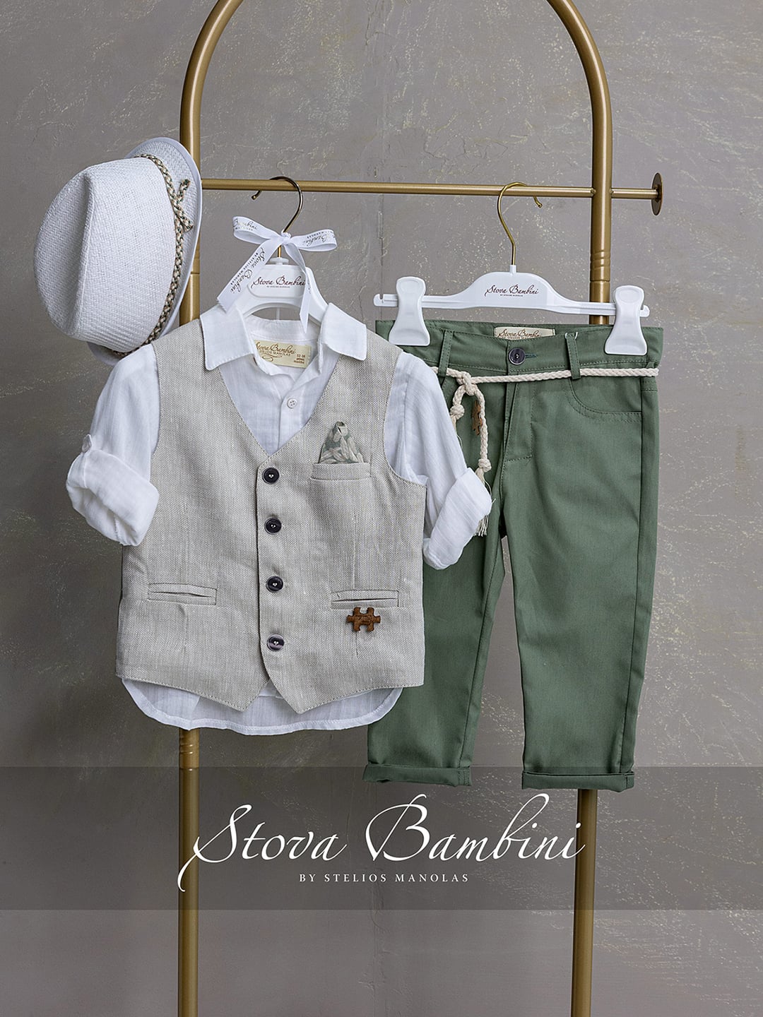 Stova Bambini βαπτιστικό σύνολο 5 τεμ. από υψηλής ποιότητας βαμβάκι, ιδανικό για τις ζεστές καλοκαιρινές εμφανίσεις με κομψότητα και άνεση. Το γιλέκο, σε κλασική γραμμή και μπεζ απόχρωση, ξεχωρίζει για την καθαρή, διαχρονική αισθητική του και διαθέτει 4 κουμπιά που ενισχύουν τον refined χαρακτήρα του. Το πουκάμισο είναι Ισπανικό, από εξαιρετικής ποιότητας βαμβακερή γάζα, που δένει με το γιλέκο, δημιουργώντας ένα απόλυτα ισορροπημένο και καλαίσθητο αποτέλεσμα. Το πράσινο βαμβακερό παντελόνι, σε καθαρή γραμμή, συνοδεύεται από ζώνη που ολοκληρώνει το outfit με κομψότητα και πρακτικότητα, ενώ το καπέλο έρχεται να προσθέσει την τελική πινελιά στυλ, χαρίζοντας μια ολοκληρωμένη, sophisticated εμφάνιση.