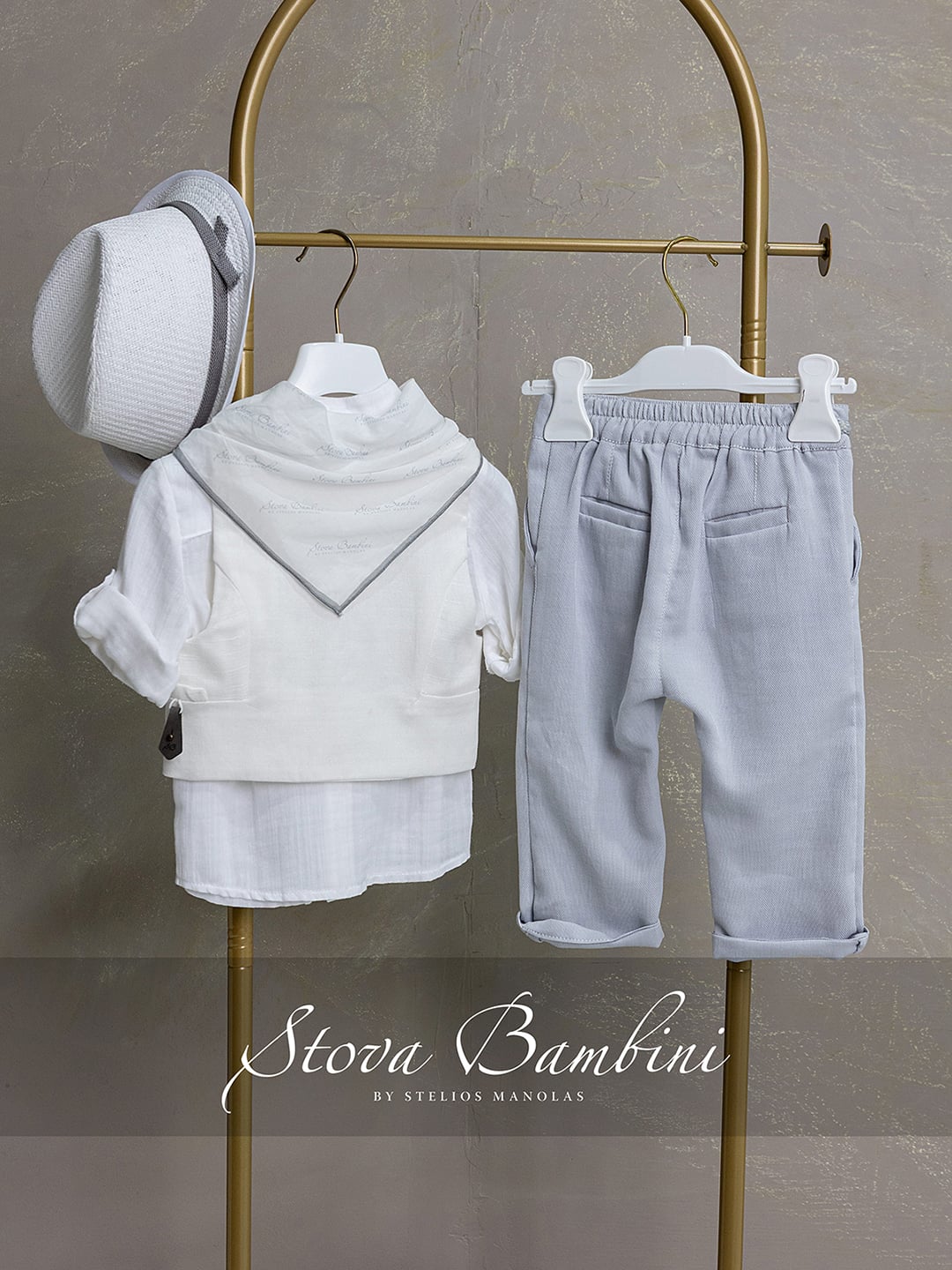 Βαπτιστικό σύνολο 5 τεμ. από 100% Top Quality υλικά. Το ασύμμετρο, κρουαζέ λευκό γιλέκο από 100% ισπανικό βαμβάκι ξεχωρίζει για τον ιδιαίτερο χαρακτήρα του, ενώ ολοκληρώνεται με κρεμαστά δερμάτινα αξεσουάρ από ιταλικό Nappa δέρμα, διακοσμημένα με το λογότυπο Stova Bambini — μια αυθεντική signature λεπτομέρεια. Το πουκάμισο με Mao γιακά είναι από βαμβακερή γάζα Ισπανίας και προσδίδει minimal κομψότητα, ενώ το νέο σχέδιο παντελονιού Stova σε light grey απόχρωση, από 100% Cotton Ιταλίας, προσφέρει άψογη εφαρμογή χάρη στη ζώνη/κορδόνι που ενσωματώνεται εσωτερικά. Το σύνολο ολοκληρώνεται με Ιταλικό printed φουλάρι με Logo Stova Bambini και ασορτί καπέλο, δημιουργώντας ένα ολοκληρωμένο, refined look.