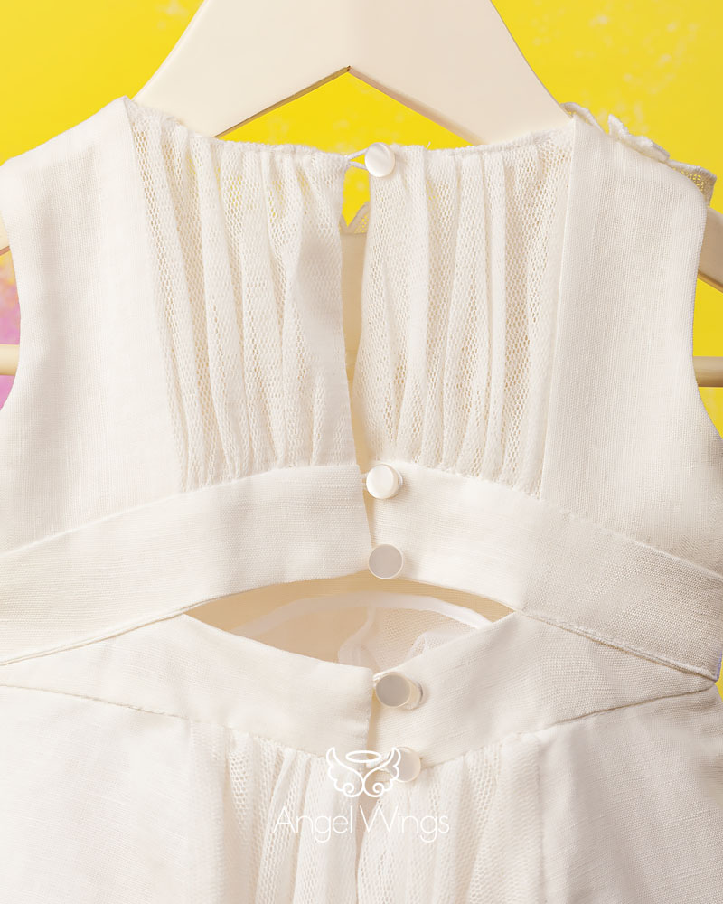 Ένα εξαίσιο φόρεμα σε off white χρώμα από λινό και βαμβακερό τούλι. Το μπούστο φαινομενικά απλό μπροστά είναι διακοσμημένο με χειροποίητα λουλούδια απλικέ και κάνει όλη την έκπληξη πίσω, με την πολύ ιδιαίτερη πλάτη από ντραπαριστό τούλι βαμβακερό. Η φούστα ομπρέλα από λινό ύφασμα δένει υπέροχα με το μπούστο ενώ πίσω έχει και μια ουρά από βαμβακερό τούλι.