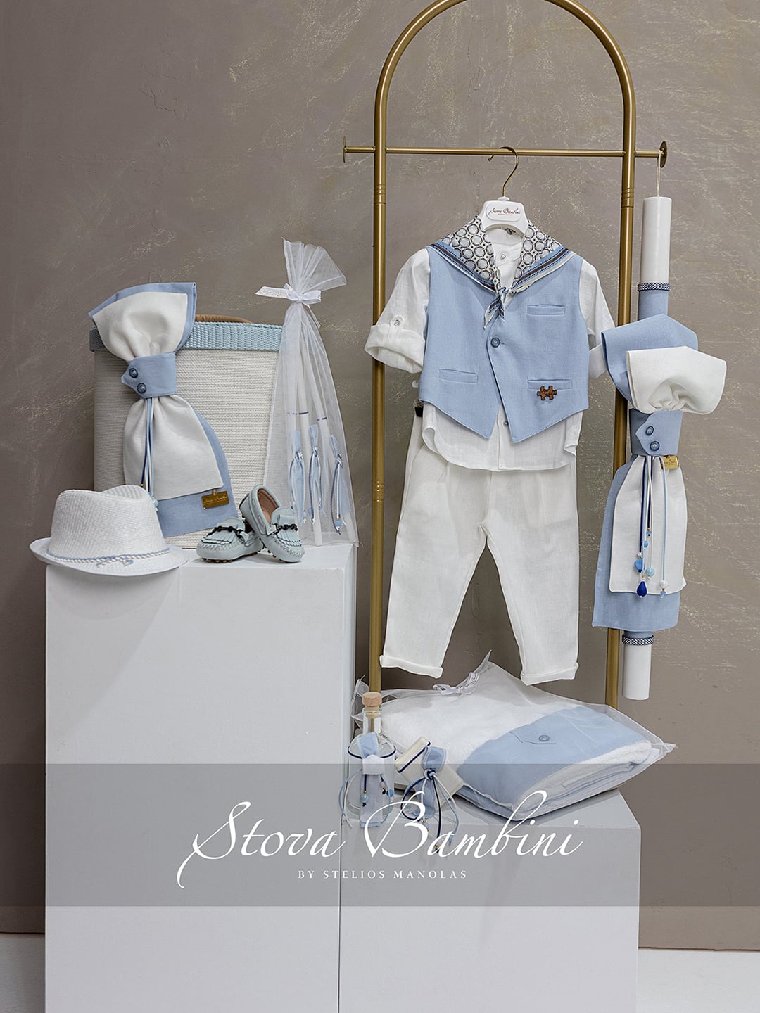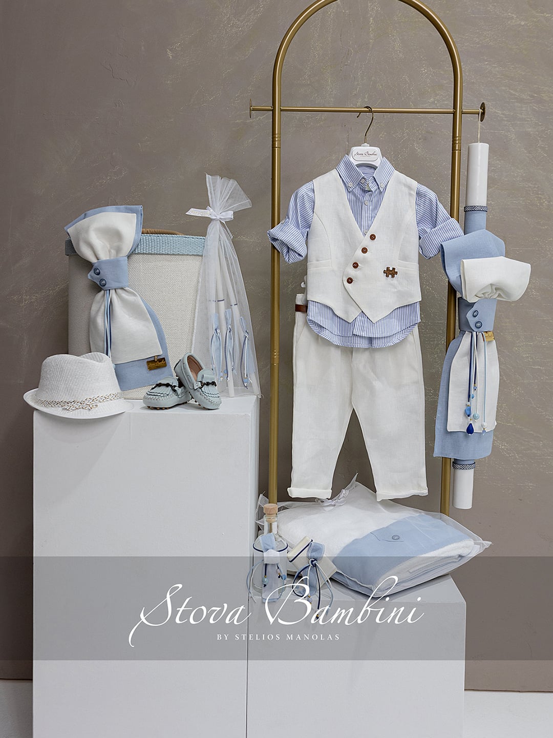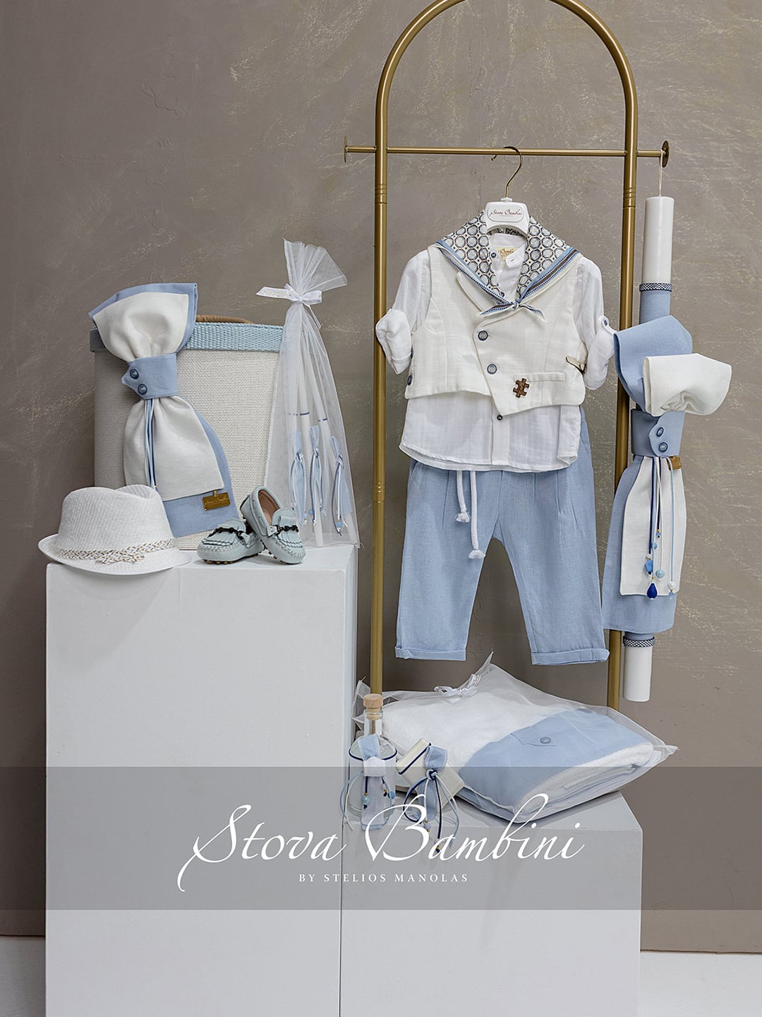 Το σετ περιλαμβάνει όλα τα απαραίτητα για μια ονειρεμένη βάπτιση: λαμπάδα βάπτισης, combo για τη βαλίτσα ή το κουτί σας, λαδόπανα, εσώρουχα, πετσέτες και λαδοσέτ.