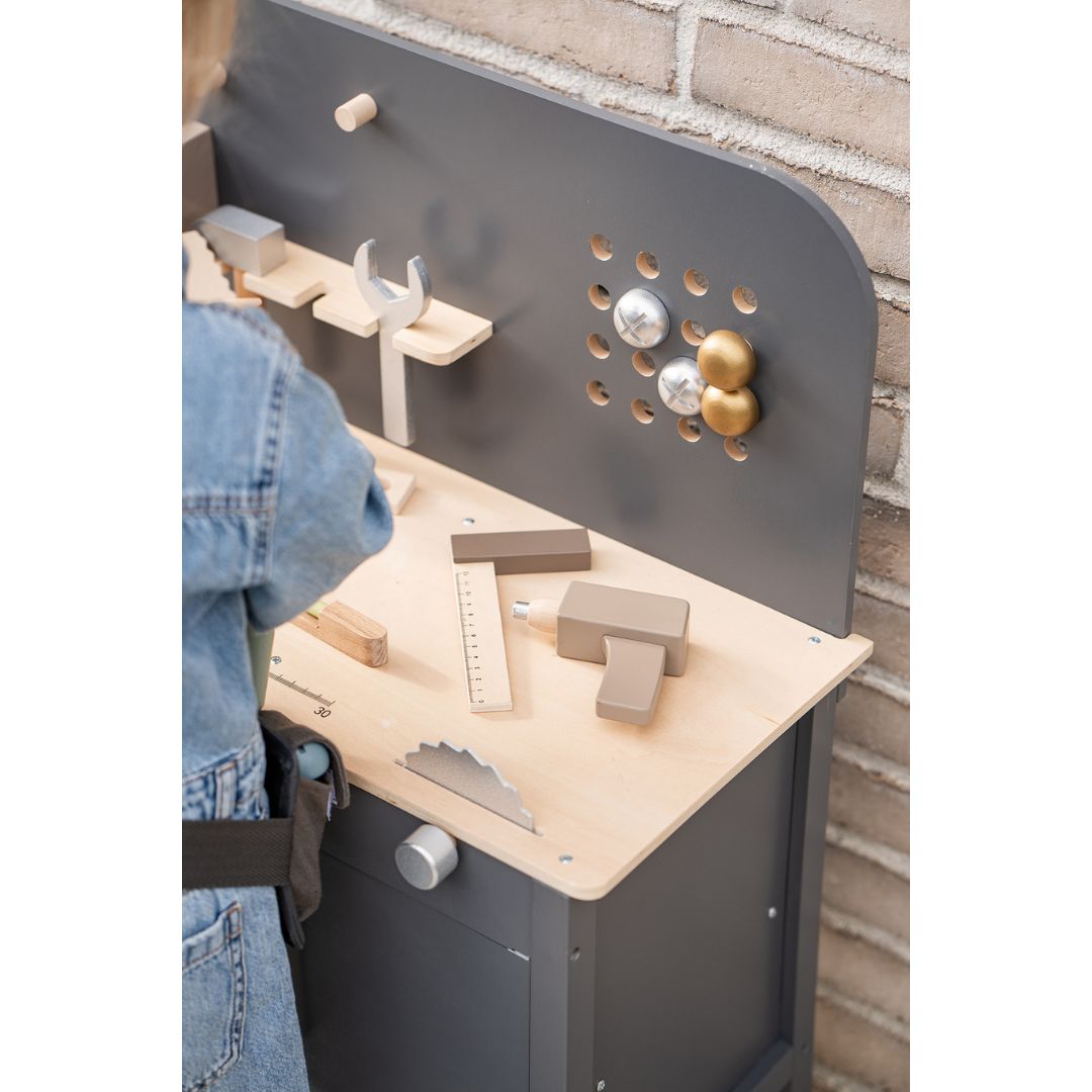 Ολοκληρωμένος πάγκος εργασίας γεμάτος με ότι μπορεί να χρειαστεί ένας μικρός μαραγκός, όπως πριόνι, τρυπάνι, διάφορα εργαλεία και έξυπνους αποθηκευτικούς χώρους και τρύπες στο ταμπλό από τις οποίες μπορούν να περάσουν οι βίδες και τα καρφιά.