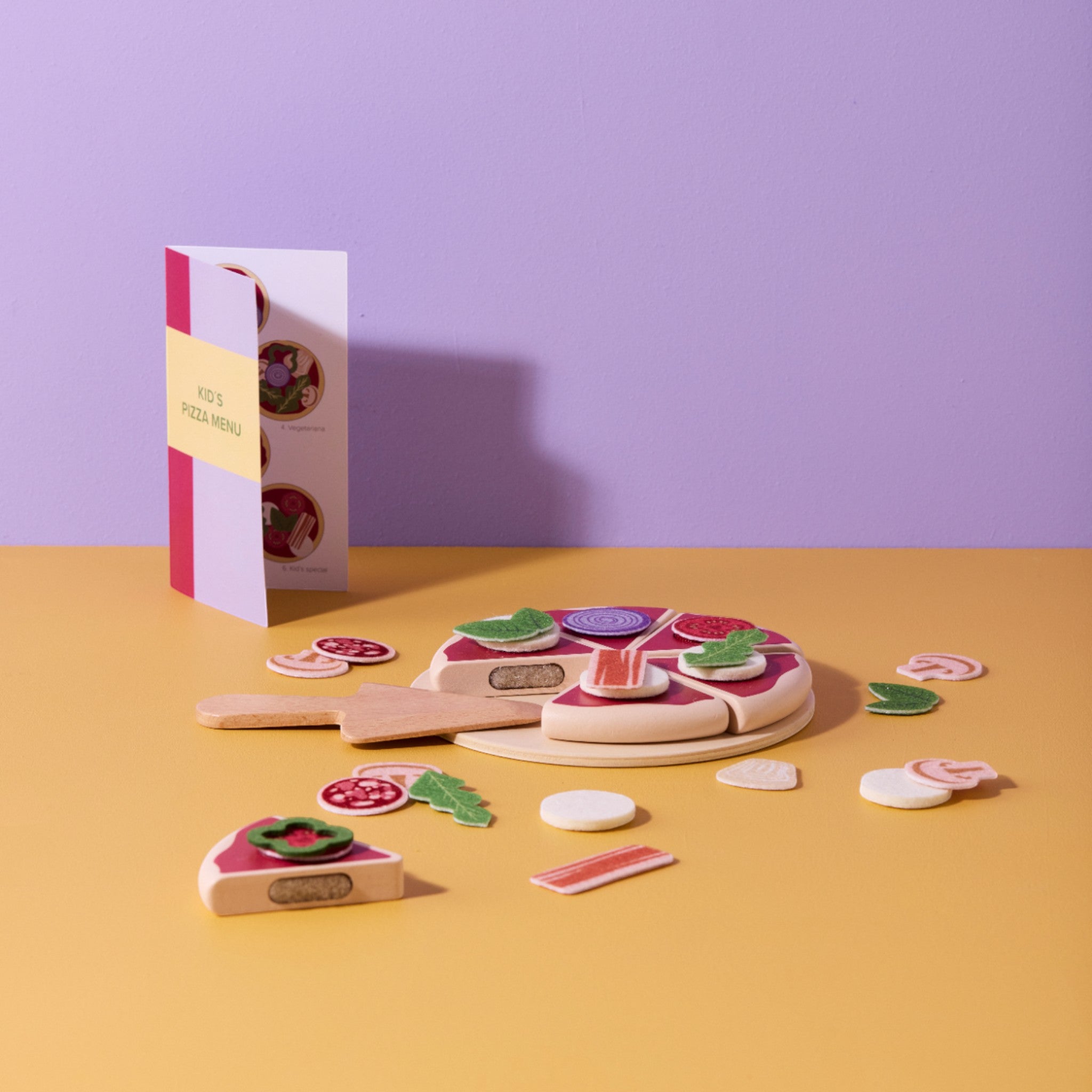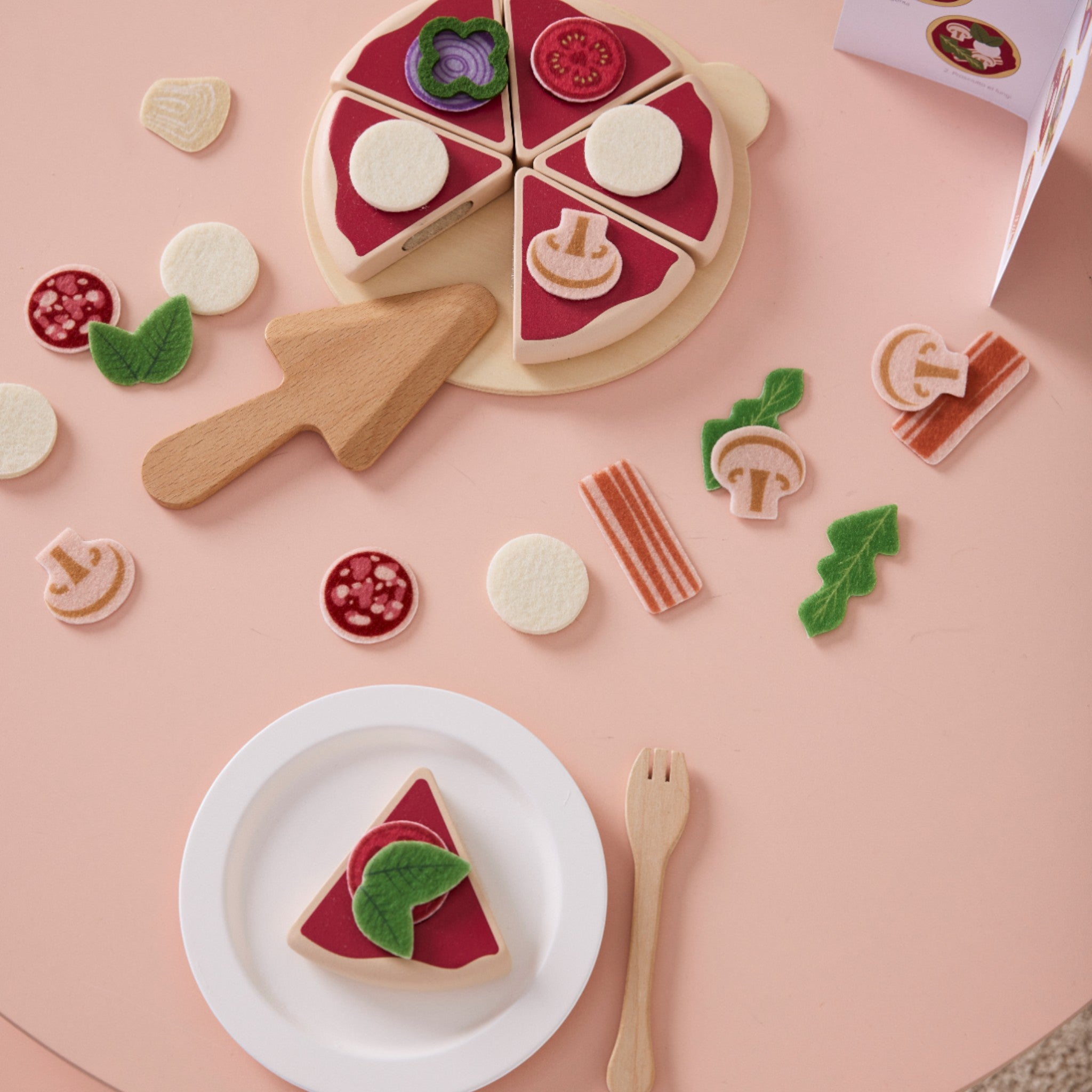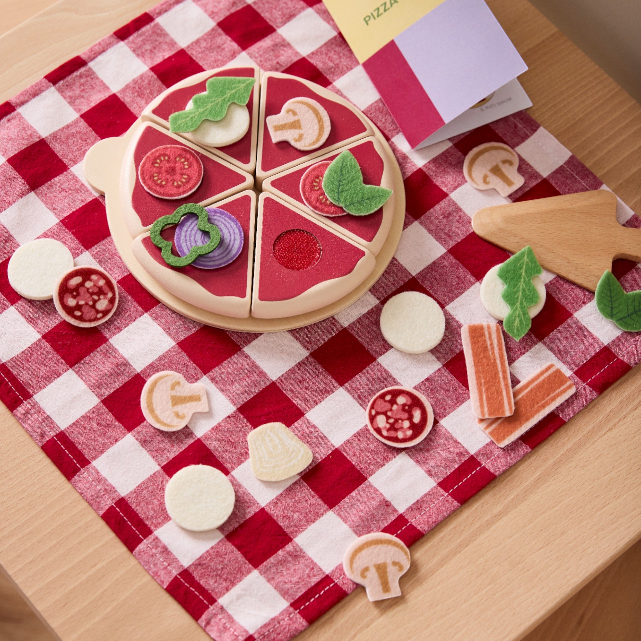 Ιδανικό για μικρούς σεφ, αυτό το παιχνιδιάρικο σετ περιλαμβάνει μια πίτσα με έξι κομμάτια που συγκρατούνται με βέλκρο, καθώς και 22 τσόχινα υλικά όπως ντομάτες, σαλάμι, ρόκα, πράσινη πιπεριά, μανιτάρια και άλλα. Με σπάτουλα, δίσκο και μενού που περιλαμβάνονται, το παιδί σας έχει όλα όσα χρειάζεται για να φτιάξει τις αγαπημένες του πίτσες και να τις σερβίρει με στυλ.