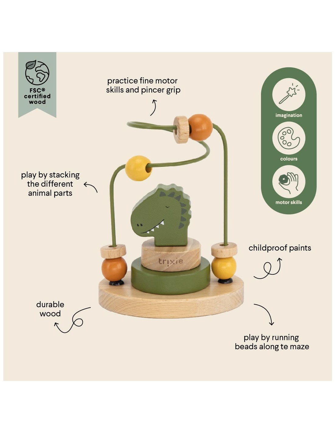 Ένας μικρός λαβύρινθος με χάντρες για να εξασκήσετε τις λεπτές κινητικές δεξιότητες! Οι χάντρες με διαφορετικά χρώματα και σχήματα γλιστρούν κατά μήκος του σύρματος. Και τι διασκεδαστικό να στοιβάζετε τα διάφορα μέρη με τη σωστή σειρά, μέχρι να ολοκληρωθεί το ζωάκι! Το μικρό σας θα διασκεδάσει ώρες με αυτό το προϊόν προσπαθώντας να κατακτήσει αυτές τις δεξιότητες. Ο λαβύρινθος με χάντρες είναι κατασκευασμένος από ξύλο οξιάς υψηλής ποιότητας 100% πιστοποιημένο με FSC®. Όλα τα χρώματα σε αυτό το προϊόν είναι με βάση το νερό. Διατίθεται σε διαφορετικά ζώα.