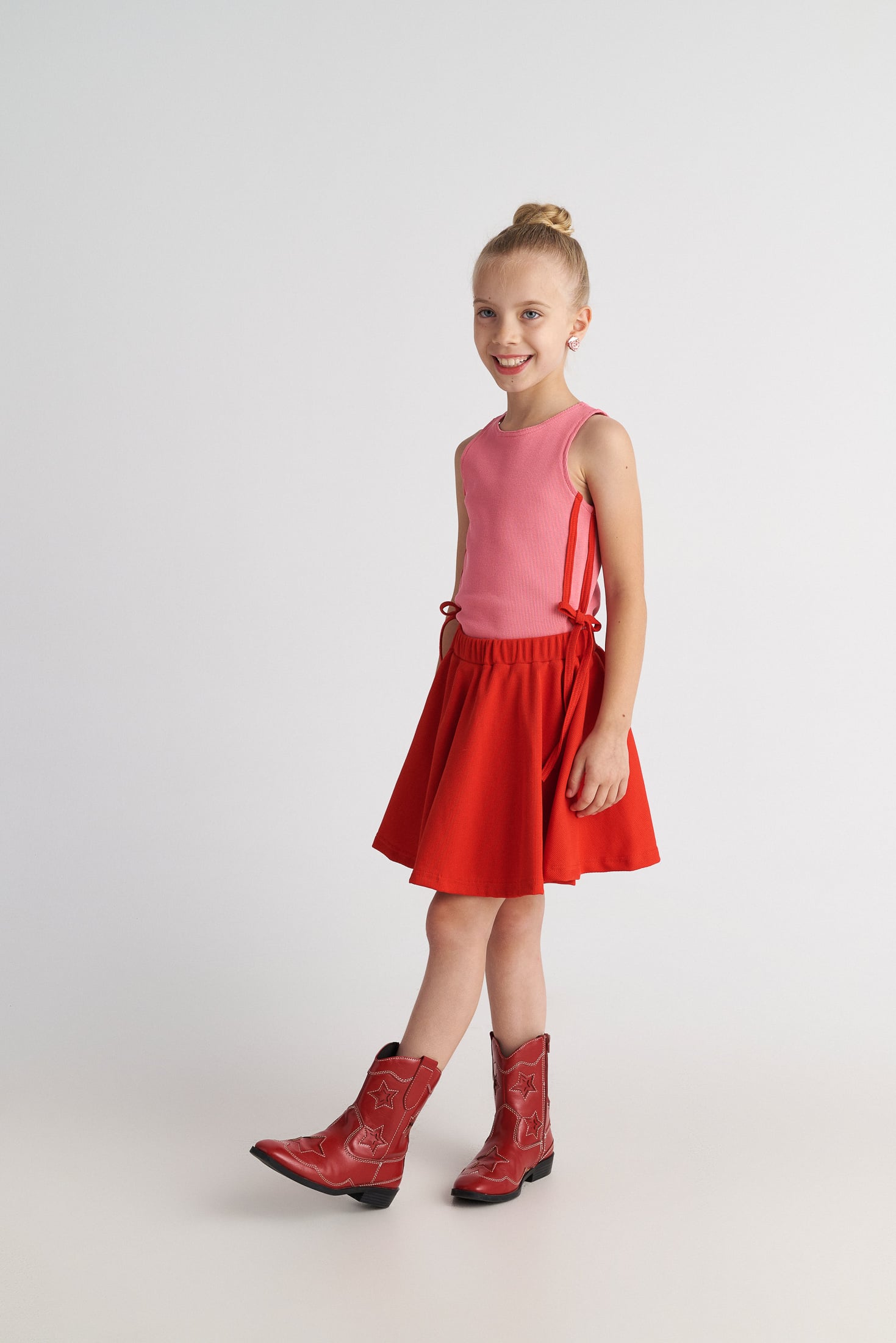 The first set is inspired by ballet aesthetics, combining a fitted bodysuit with a flowing circle skirt, creating a graceful silhouette. It is available in two striking color combinations: red with pink accents, and black with ice grey, offering both bold and refined options.