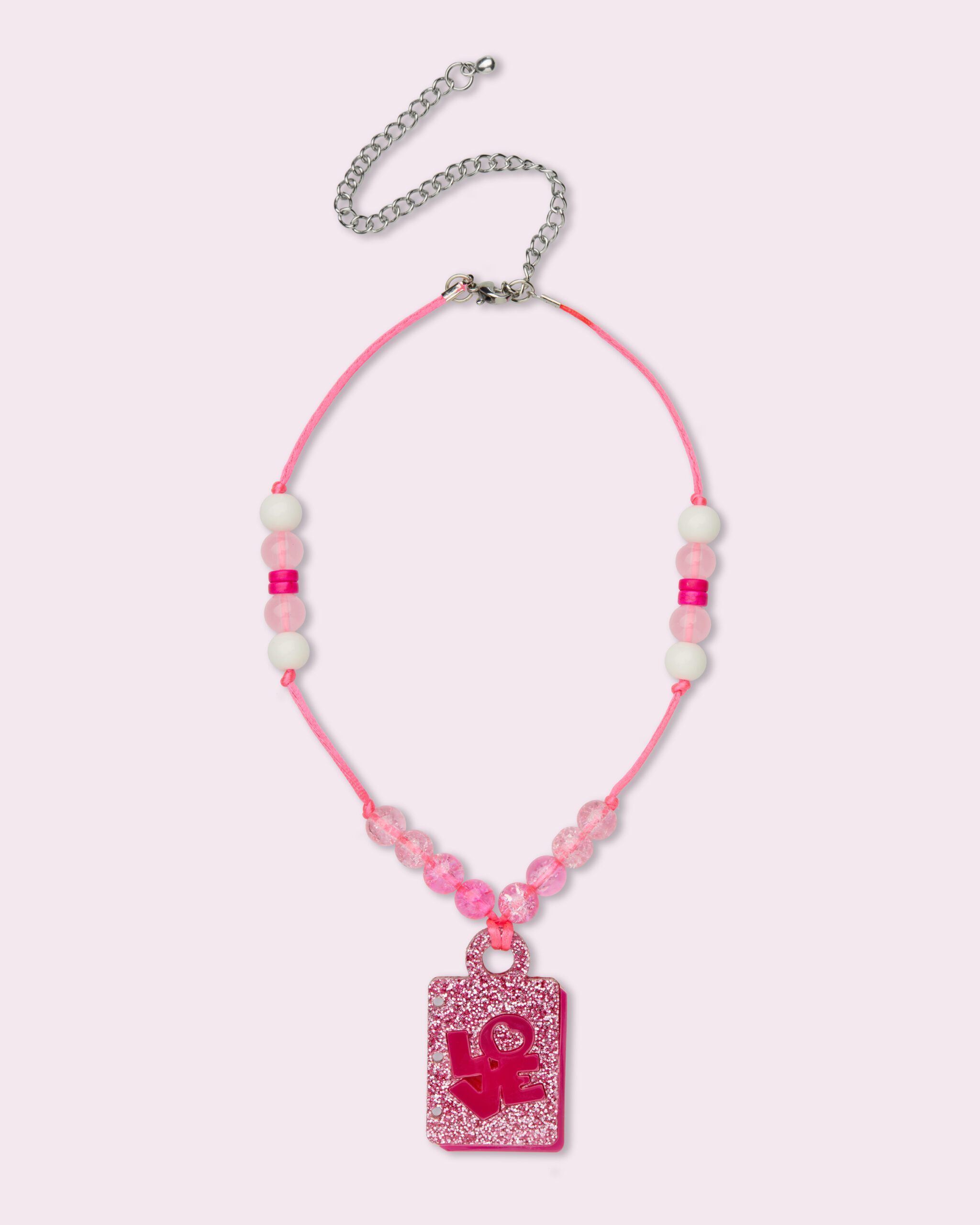 Book necklace in pink glitter and fuchsia colours and pink glass beads. Fastens with stainless steel lobster claw clasp and extendable chain to fit all sizes.