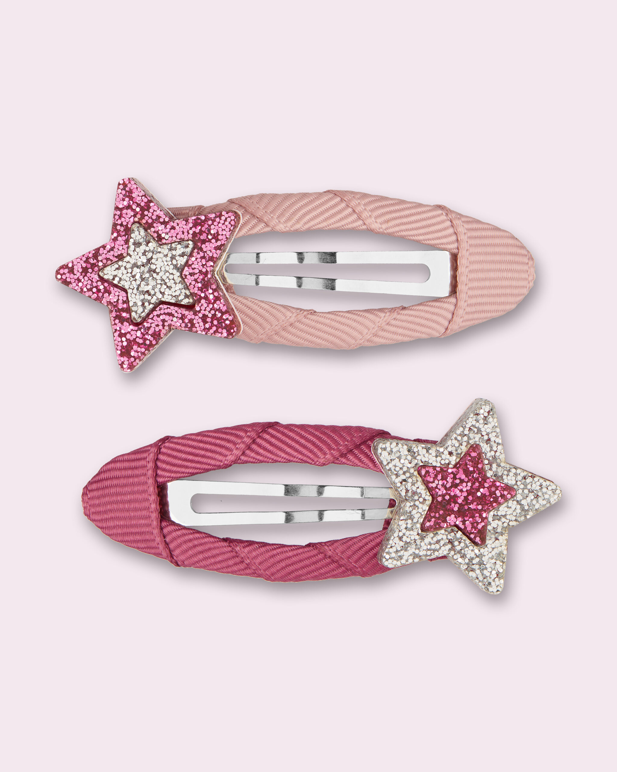 Dusty pink and dusty rose ribbon hairclips with amethyst and silver glitter stars.