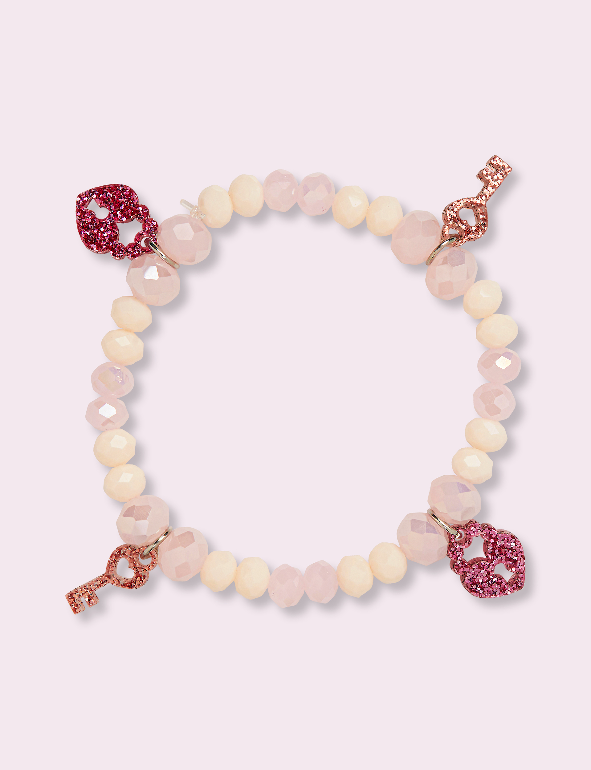 Heart lock and key glitter charms bracelet with crystal glass beads, elastic to fit any wrist, big or small.