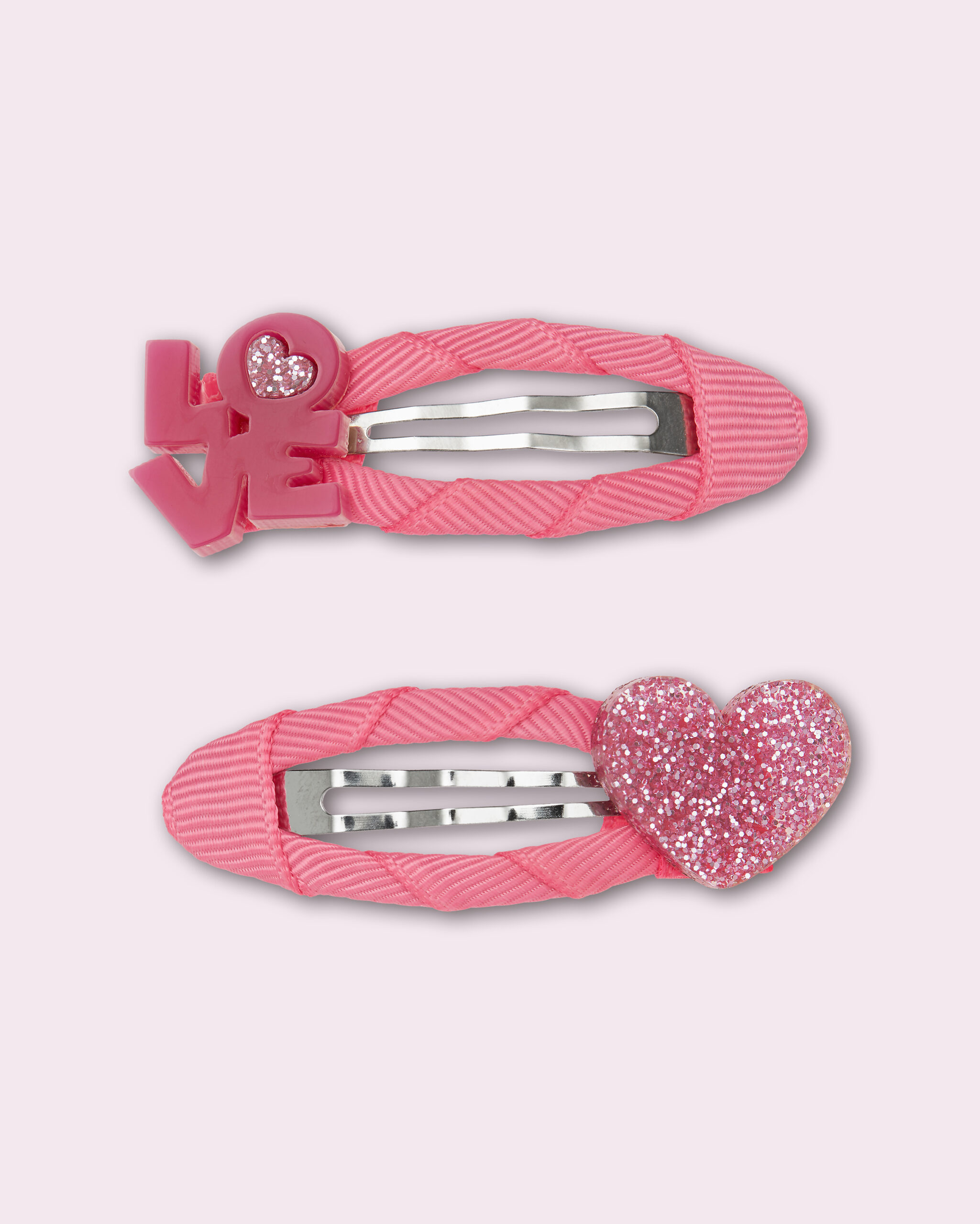 Fuchsia ribbon hairclips with fuchsia love letters and pink glitter heart charms.
