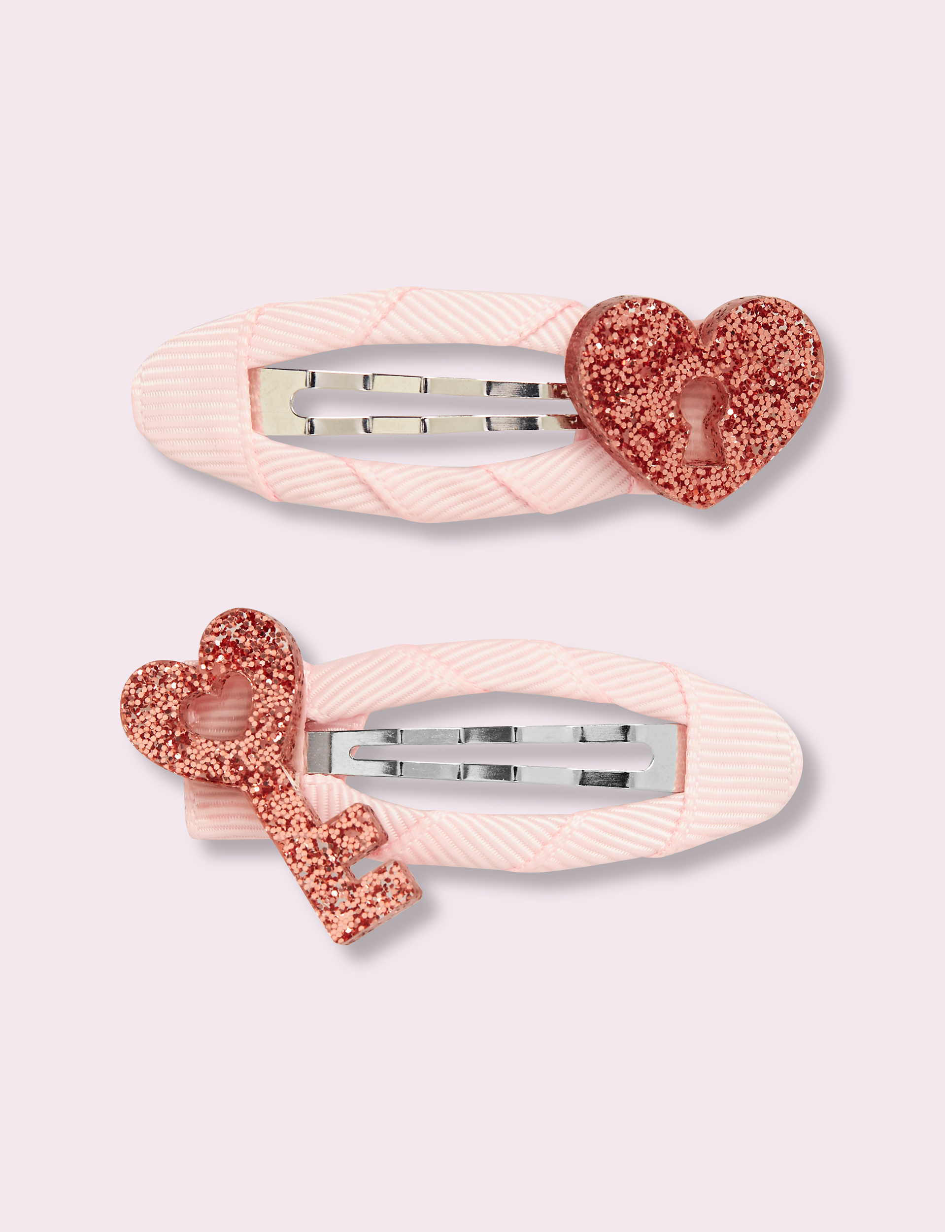 Rose ribbon hair clips with amethyst glitter heart lock and key charms.