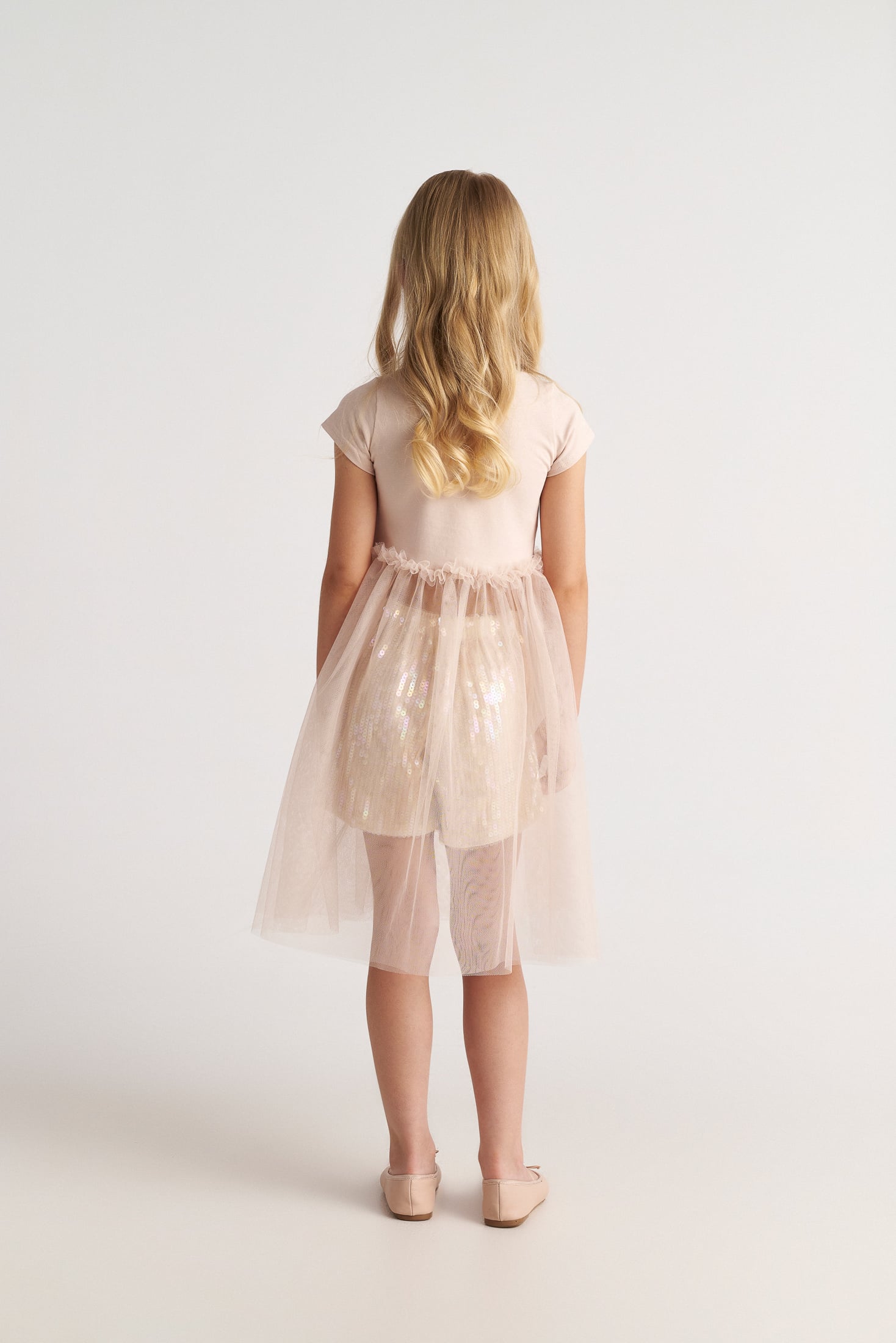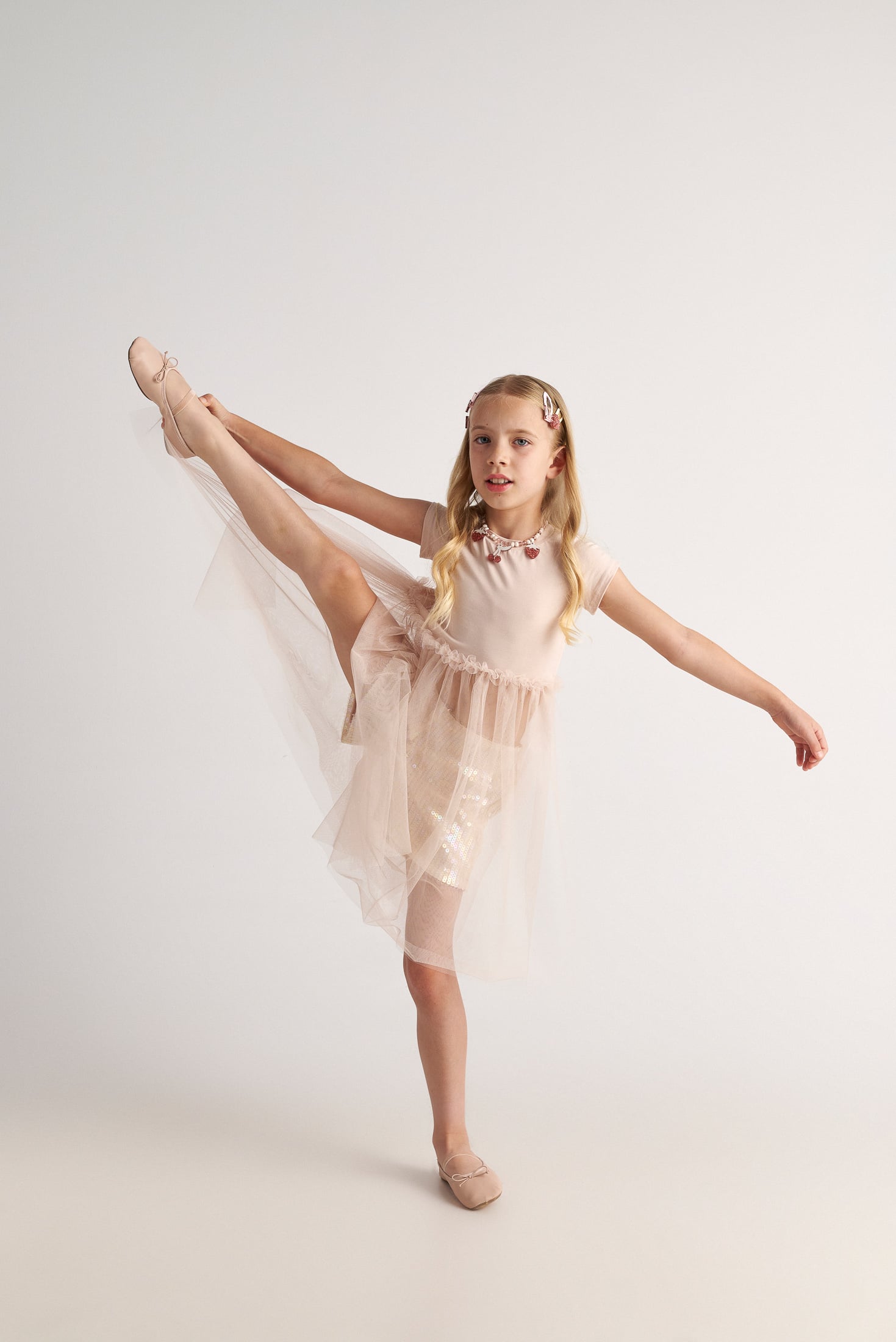 a refined T-shirt and skirt set, combining sequins and tulle for a balanced mix of shine and softness, and a playful tutu T-shirt and sequin shorts set, adding movement, sparkle, and modern charm.